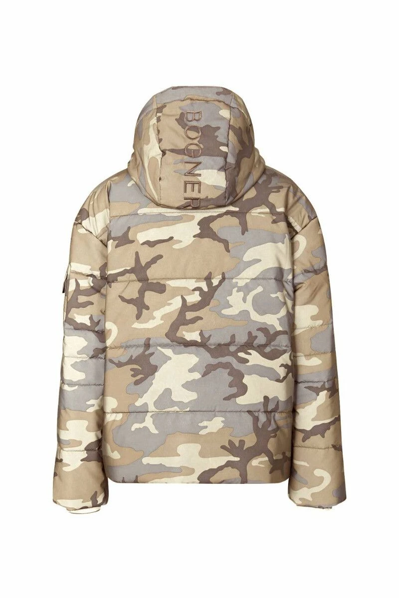 De Bogner Lora ski-jas is een blikvanger op de piste met zijn innovatieve coating gemaakt van harsachtige vezels. De sterk reflecterende look met camouflagedesign zorgt voor een stedelijk karakter, dat wordt benadrukt door de moderne puffer-stijl met kenmerkende ritsen. Aangevuld door de brede opstaande kraag, de capuchon met logoborduursel en gestreepte geribde manchetten ontstaat een harmonieuze afwerking, die wordt afgerond door het trekkoord in neon-look.